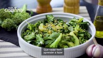 Ingredientes: 2 maços de brócolis 3 litros de água sal a gosto 20 g de bicarbonato de sódio 3 colheres (sopa) de azeite 10 dentes de alho 500 g de arroz cozido