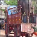 A small elephant much cautiously setp down from high height lorry