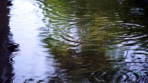 Rain falling on the water of a lake seen up close.