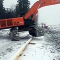 Ce conducteur de pelleteuse chevauche un tuyau avec son engin... doué