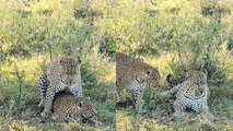 Engaging footage taken by Evans Keshe shows a leopard humping its partner before taking a break, circling its tired partner for a while, and then getting ready for a role reversal.
