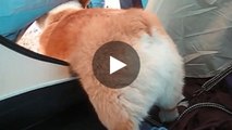 Ein süßer Corgi hat Probleme, aus dem Zelt herauszukommen.