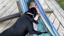 Dog jumps into hammock while little girl lounges in it during family trip