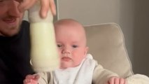 'Footage has surfaced of a darling baby boy fighting an uphill battle to get his bottle of milk.