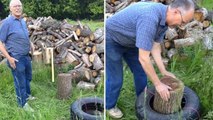 L'astuce du pneu pour fendre du bois plus facilement