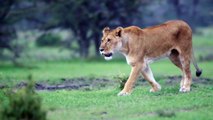 Panning shot of lioness prowling 01