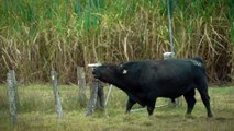 black cows roar in the fields