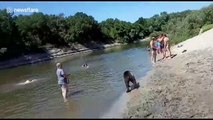 2 ours viennent se baigner dans la piscine de ces touristes