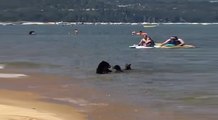 Une famille ours profite de la plage et se baigne au milieu des touristes