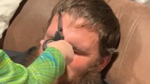 In this amazing clip, a father calmly and creatively styles his daughter's hair while catching it in the pipe of the vacuum cleaner.
