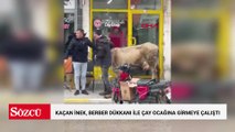 Kaçan inek, berber dükkanı ile çay ocağına girmeye çalıştı