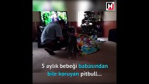 Minik bebeği koruma altına alan pitbull
