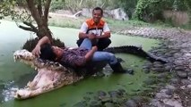 incredible, this person is lying on top of a crocodile