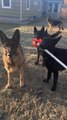 : "I'm a pet service provider in Nova Scotia, Canada! During one of my group hikes, I noticed two of the Golden Retriever's and my German Shepherd playing tug of war with a stick. My German Shepherd, Lora, was super loud and started hopping with every pull. It was so funny that I had to get a video of it!"