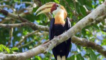 An endemic hornbill species that only occurs on the island of Sumba, Indonesia. This species is a large bird that usually lives in the forest canopy. The characteristics of the Sumba hornbill are small and black in color, with a long, all-black tail. The head and neck are brick red with blue throat skin, serrated cassava and pale yellow beak.