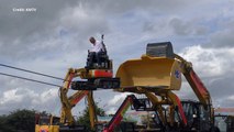 Diggerland chairman Hugh Edeleanu sets world record for driving a digger over a tightrope.