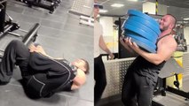 A guy tries to lift two heavyweights simultaneously with the help of his two gym buddies.