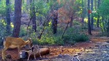 Le daim buvant de l'eau et son petit pris dans l'appareil photo