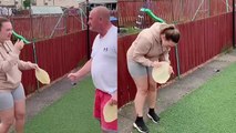 This humorous footage features Dennis Fitzakerley being filmed as he is asked by his daughter to 'skip,' something he must have done a lot in his childhood days.