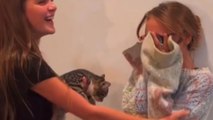 The reason for this sudden shift in emotions becomes evident as she lays eyes on her very own furry friend, a charming kitty.