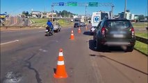 Motociclista sofre queda para evitar colisão contra Fusca no Trevo da Portal; Veja o vídeo