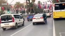 Canını tehlikeye attı! Fatih'te patenli gencin tehlikeli yolculuğu kamerada