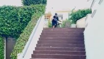 While walking down the steps, he ends up slipping and crashing, causing the glass in his hands to shatter in the process.
