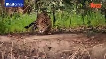 Leopar, su içerken suyun içinden çıkan timsah tarafından avlanıyor