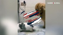 Sahiplendiği köpeğe hiç kimseyi dokundurmayan kedi güldürdü