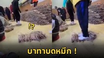 เบื้องหลังผลิตหมึกตากแห้ง บดให้แบนด้วยบาทา เห็นแล้วอ้วกแทบพุ่ง กินลงไหมถามใจดู !?