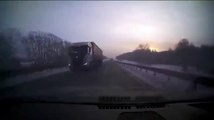 Car Squeezing Between Trucks (video)