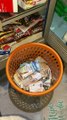 Câlins de chat dans un panier rempli d'argent