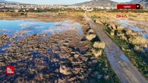 Hatay'da yağışlarla birlikte suyla dolan Milleyha Kuş Cenneti dron ile görüntülendi
