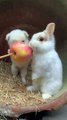 Dog and bunny chew apples together. Cute little pets in the countryside. Golden Sun Original