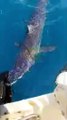 Heyecanla yakaladığı 2 buçuk metrelik devasa köpek balığını denize bıraktı