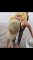 Beautiful Woman Hunting Big Mud Crabs In The Sea During Rain