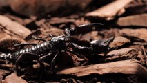 Black scorpion walking closeup