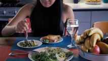 Girl eating salad in her kitchen dining room