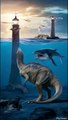 Dinosaur fighting with whale near light house