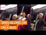 Lead singer Fran Healy, 50, leaned from the back of the hop-off exit as he serenaded fans walking through the city.