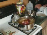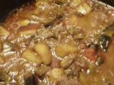 My own twist on Hungarian Stuffed Cabbage. Ingredients include: cabbage, ground veal, pork, and beef - about 2 pounds total, 2 cuts of cooked rice, one large onion, diced, 3-8 cloves of garlic (it's up to you), 1-2 eggs (optional), thyme - fresh is best of course, one large red sweet bell pepper - diced, one bag of saurkraut, 2 cans of diced tomatoes - I like the fire-roasted diced tomatoes that Hunts makes, salt. I like my food spicy so pick a nice hot pepper or two and add if you like.