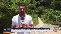 Reportagem flagra ao vivo motociclista cortando caminho por passarela de madeira em Blumenau