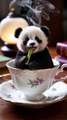 Miniature Panda Sitting on a Teacup Rim: