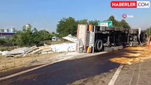 Otoyolda çimento yüklü tır devrildi