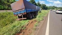 Motorista escapa ileso após caminhão derrapar e sair da pista na BR-163 em Cascavel