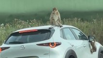 Monkeys climb a car and a camel blocks the road in a safari adventure
