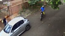 Câmera flagra momento em que motociclista bate violentamente na traseira de carro estacionado; assista