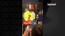 Jogadores desembarcam do ônibus em hotel de Buenos Aires e falam com torcedores.