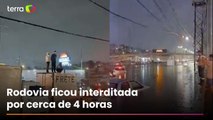 Motoristas precisam se abrigar no teto de caminhão após chuva alagar trecho da Dutra no RJ
