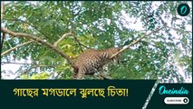গাছের মগডালে ঝুলছে চিতা! নিচে মানুষের ভিড়, তাড়া খেয়ে কী করল বাঘ বাবাজি?